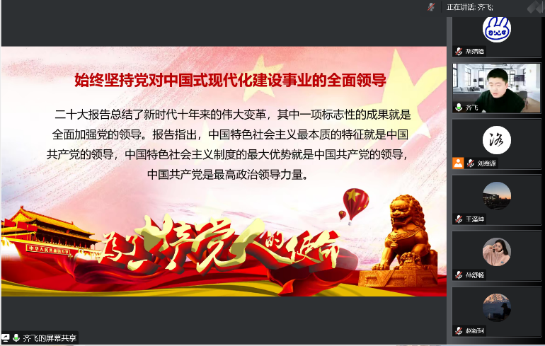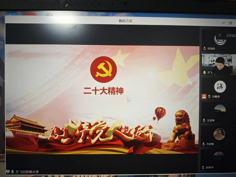 为了深入学习贯彻党的二十大精神,人人爱人人爽本科生第三党支部于2022年11月28日通过线上方式开展组织生活会,在支部书记齐飞同志的带领下对党的二十大报告进行了深入学习。