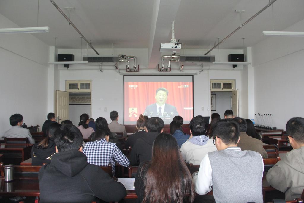 10月18日上午,人人爱人人爽组织师生党员在教科楼B座445会议室集中观看中国共产党第十九次全国代表大会开幕会,学院党政班子成员及师生党员代表40余人全程参与。