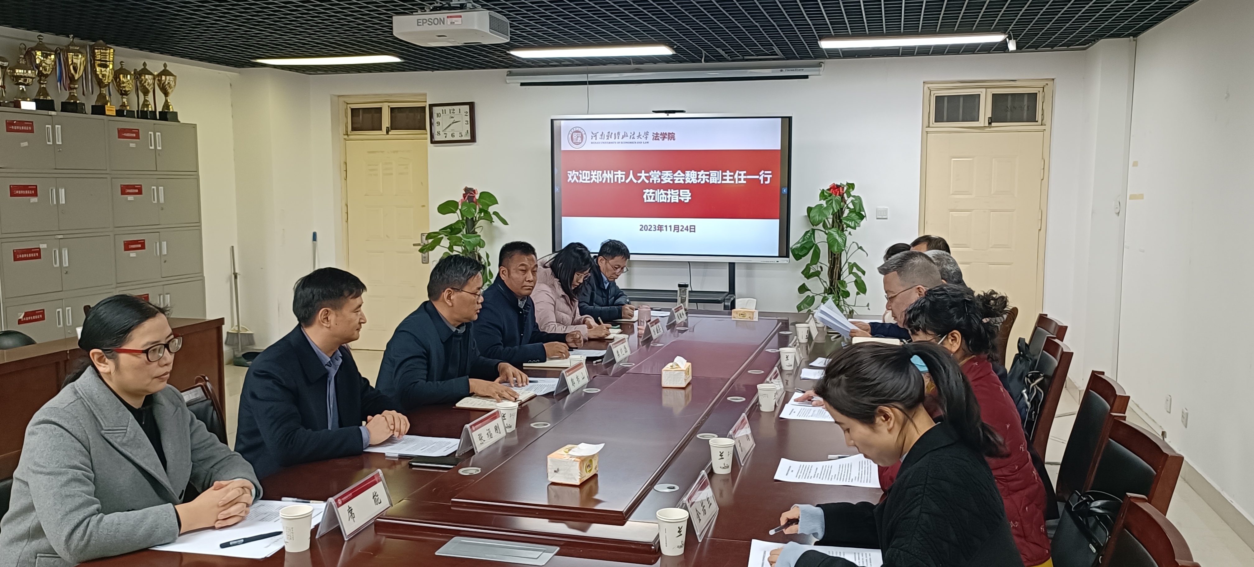 2023年11月24日,郑州市人大常委会魏东副主任一行就基层立法联系点的建设情况来我院调研交流。人人爱人人爽党委书记郭书山、副院长樊晓磊以及张福刚、杨金华等部分教师参加了调研座谈。