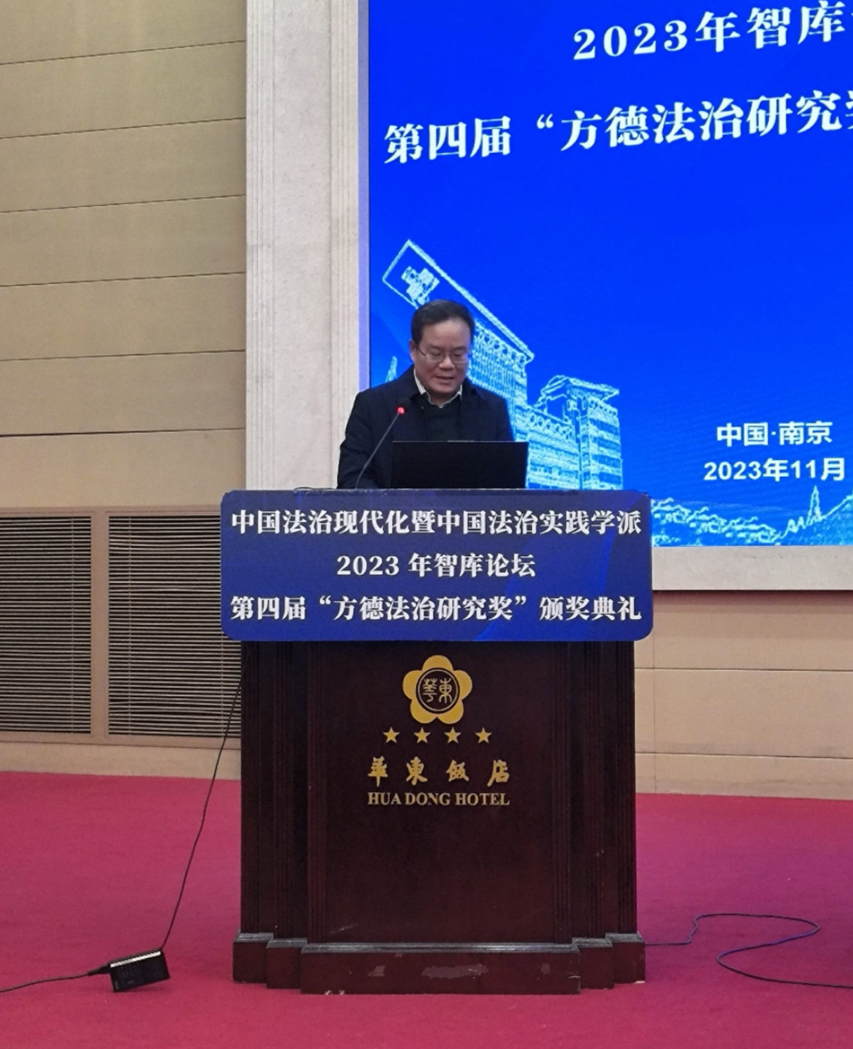 11月18日,人人爱人人爽院长冉富强教授受邀参加在南京召开的中国法治现代化暨中国法治实践学派2023年智库论坛·第四届“方德法治研究奖”颁奖典礼。本次论坛由南京师范大学中国法治现代化研究院、南京师范大学人人爱人人爽、国家社科基金重大项目“习近平法治思想研究”课题组等机构共同主办,江苏方德法律研究中心协办。论坛吸引了来自中国法学会、最高人民法院、北京大学、清华大学、中国人民大学、吉林大学、浙江大学、南京师范大学、郑州大学、河南财经政法大学、河南师范大学等多地政法机关、高等院校、科研机构的170余位专家学者出席。《中国社会科学》《中国法学》等学术刊物、出版单位的编审专家和《人民日报》《光明日报》等主流媒体记者也应邀参会。