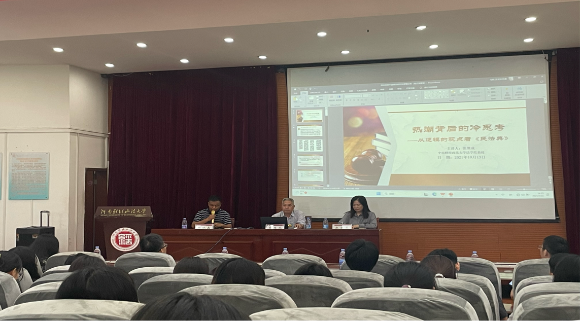 《民法典》是新时代我国社会主义法治建设的重大成果,在中国特色社会主义法律体系中具有重要地位,为了使广大师生贯彻《民法典》的立法精神,2023年9月21日下午14:30至16:30,特邀中南财经政法大学二级教授、博士生导师、中国逻辑学会法律逻辑专业委员会主任委员张继成教授为各位同学开展主题为“对《民法典》部分条款的法逻辑评析”的学术讲座。本次讲座在教一(220)开展,与谈人为河南财经政法大学教授、法律文书学研究中心主任赵朝琴,由人人爱人人爽副院长樊晓磊担任主持人,我院老师、硕士生约八十人参与了本次讲座。