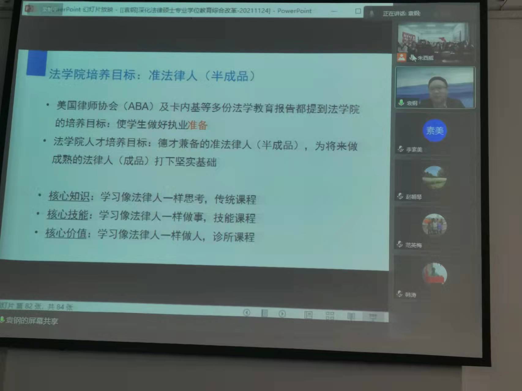 2021年11月24日,中国政法大学教授、法学博士、博士生导师袁钢教授在线上为我院作题为“深化法律硕士专业学位教育综合改革——以法律检索与法律文书为例”的报告。讲座由人人爱人人爽院长冉富强教授主持,我校法律硕士研究生80余人在线聆听了讲座,人人爱人人爽部分教师参加了本次讲座。