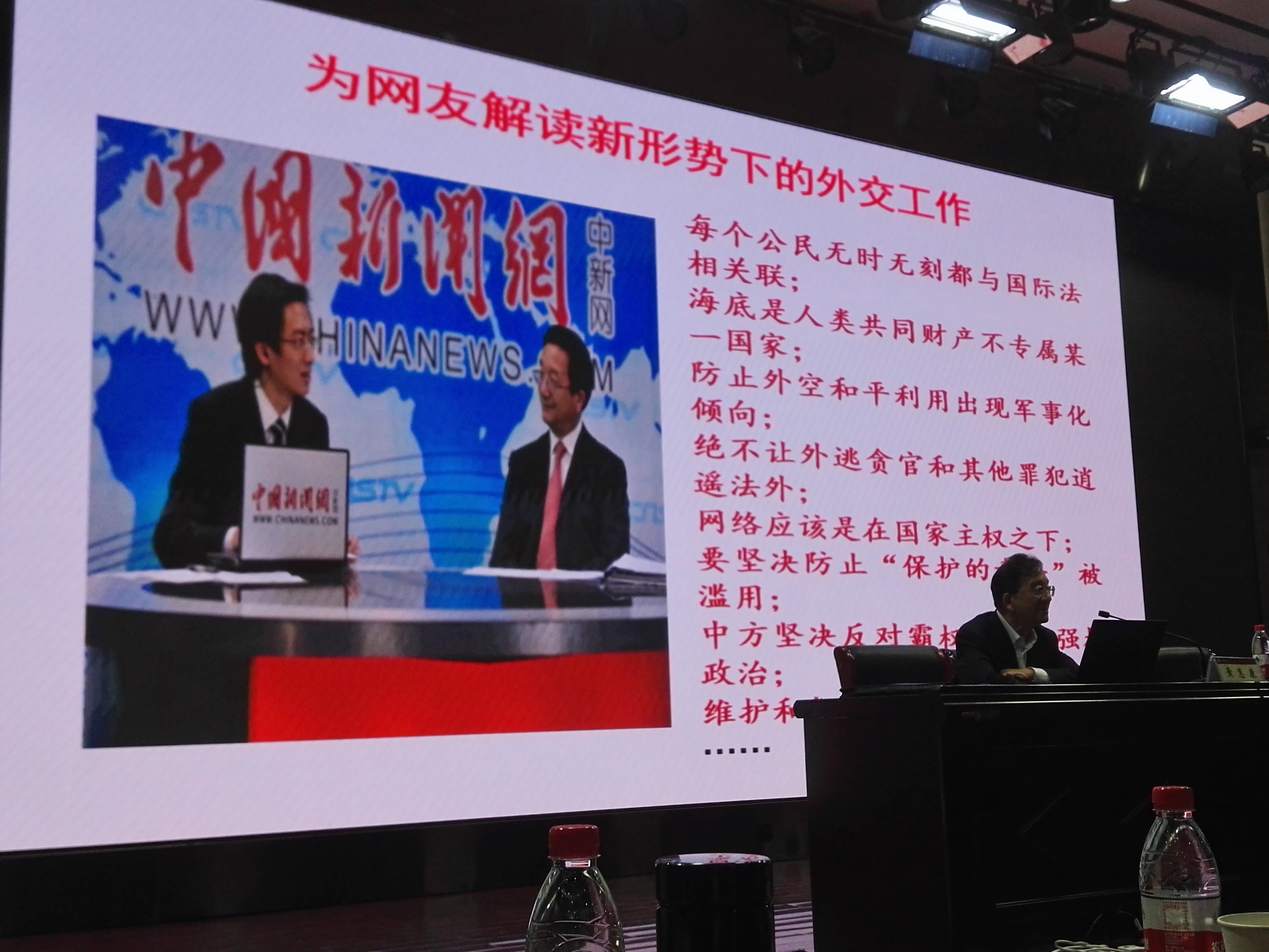 黄惠康首先以生动形象的语言讲述了我国“四位一体”的外交格局;然后通过“绿色外交”“蓝色外交”“红色外交”和“数字外交”的具体内容,介绍新时代中国外交的新疆域;最后重点讲授我国法律外交的魅力,黄大使强调“法律外交是外交的高级形态”,通过列举经典的外交事例阐释法律在外交中的重要作用。黄惠康高屋建瓴,指出当前国际法的五大总体发展趋势。第一,全球治理体系和国际秩序加速变革;第二,国际竞争从传统疆域向海空网极新疆域扩展;第三,网络空间战略地位上升;第四,全球环境治理机制的推进;第五,国际法日益成为外交的重要抓手。