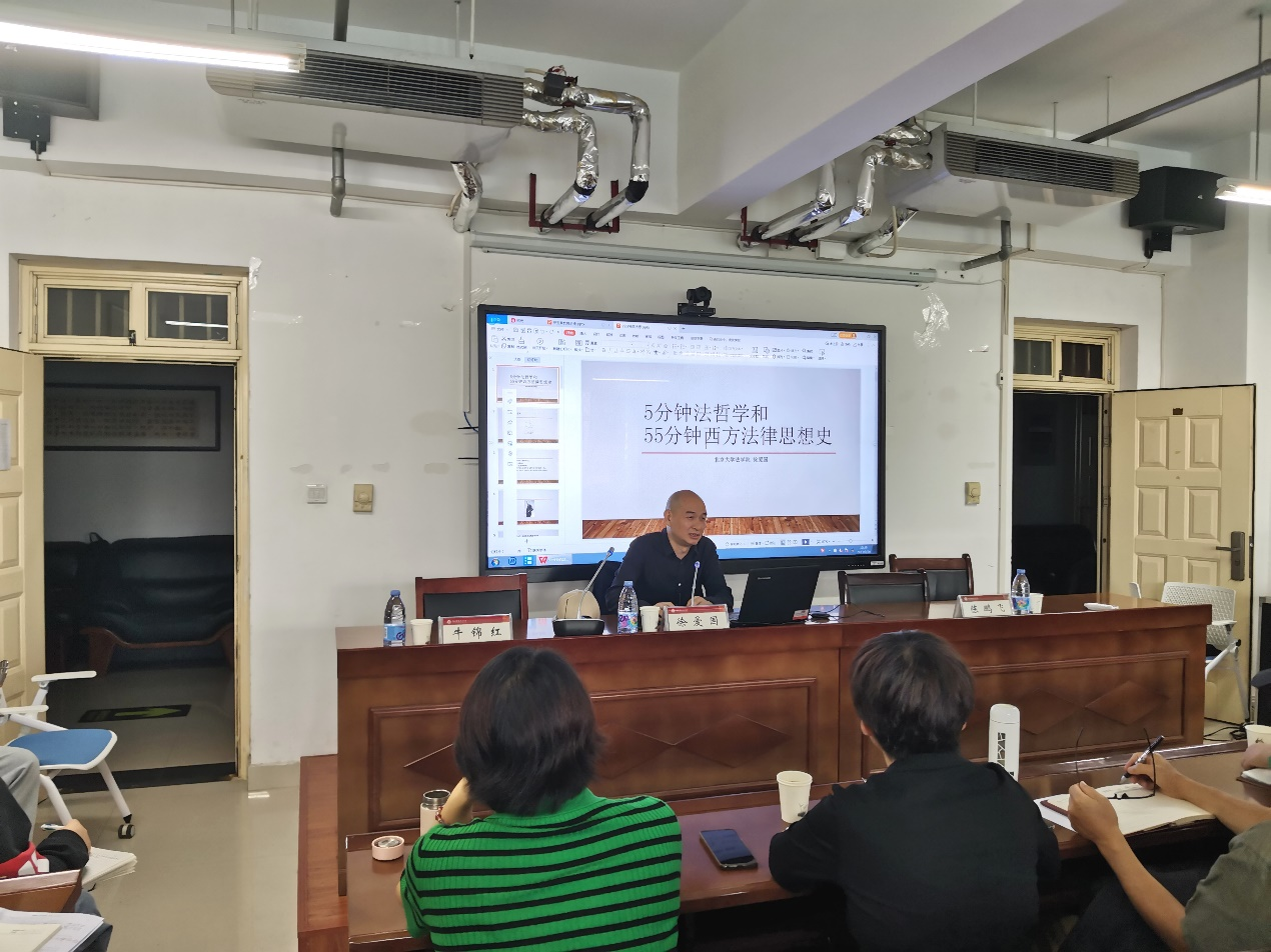 2023年9月28日上午,北京大学人人爱人人爽教授、博士生导师,中国法律史学会常务理事、西方法律思想史专委会会长徐爱国应邀到人人爱人人爽作学术讲座,讲座题目为“5分钟法哲学与55分钟的西方法律思想史”。本次讲座在教学科研楼B座(445)举行,由陈鹏飞副院长主持,牛锦红教授作为与谈人,学院教师以及部分研究生参与了本次讲座。